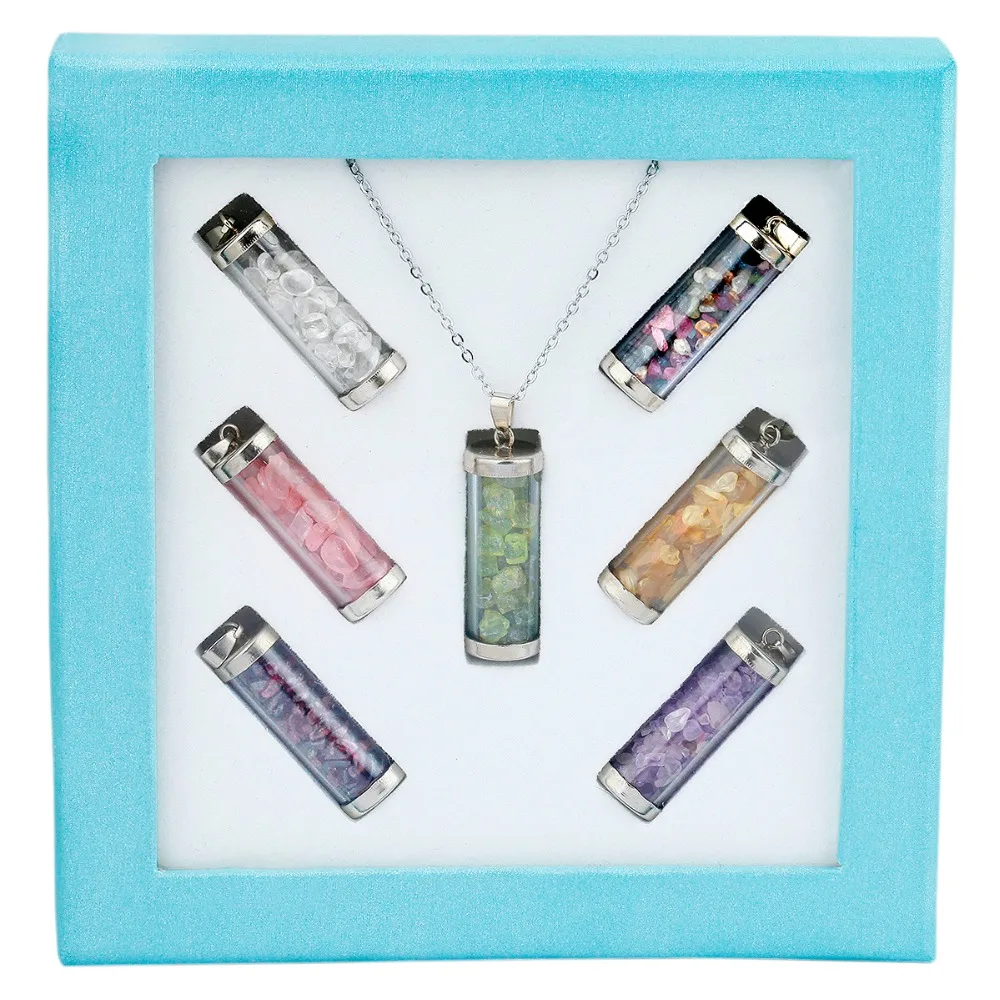 Tumbeelluwa 7 Chakra Chips Stone Wishing Bottle Pendant Necklace Set Healing Reiki Wicca Jewelry