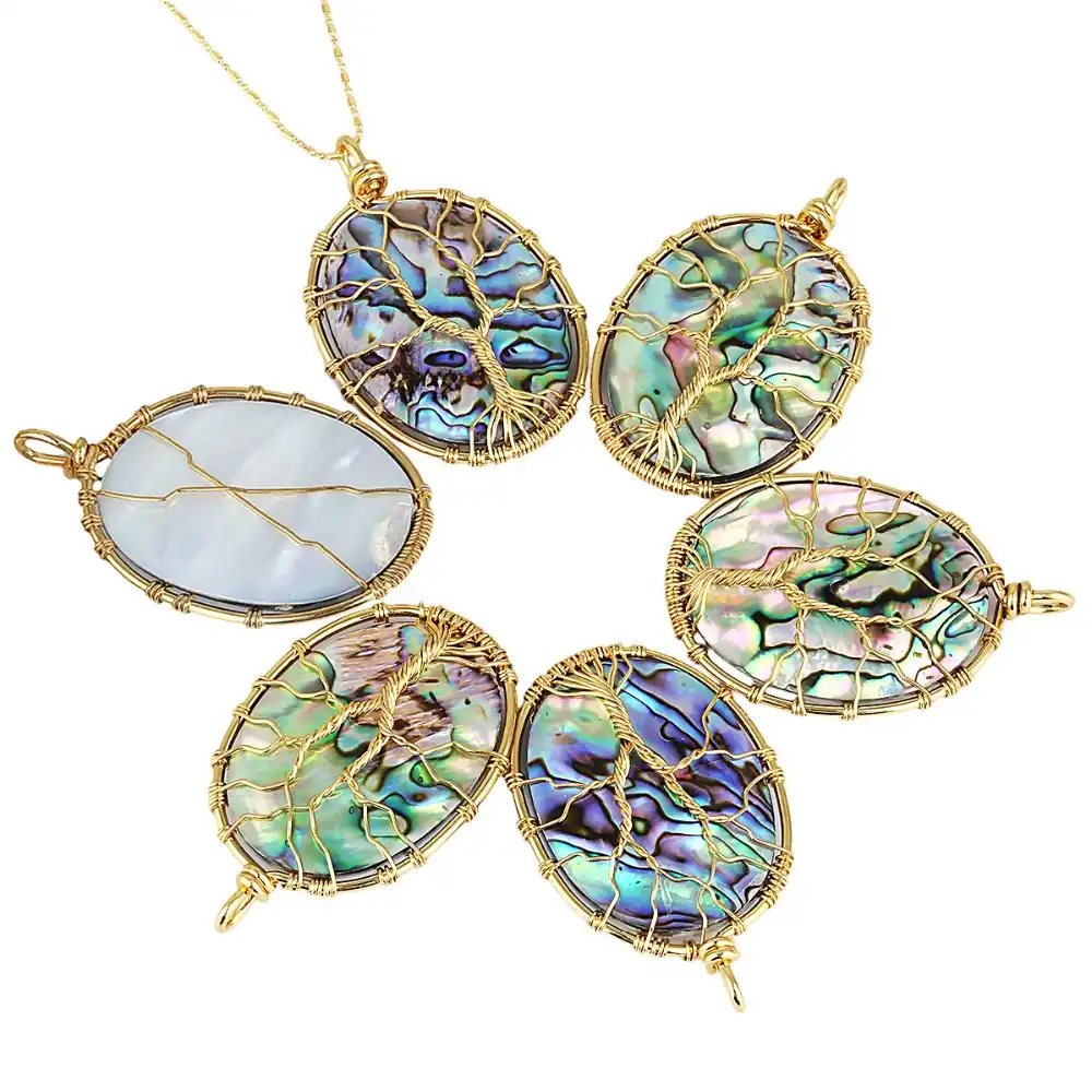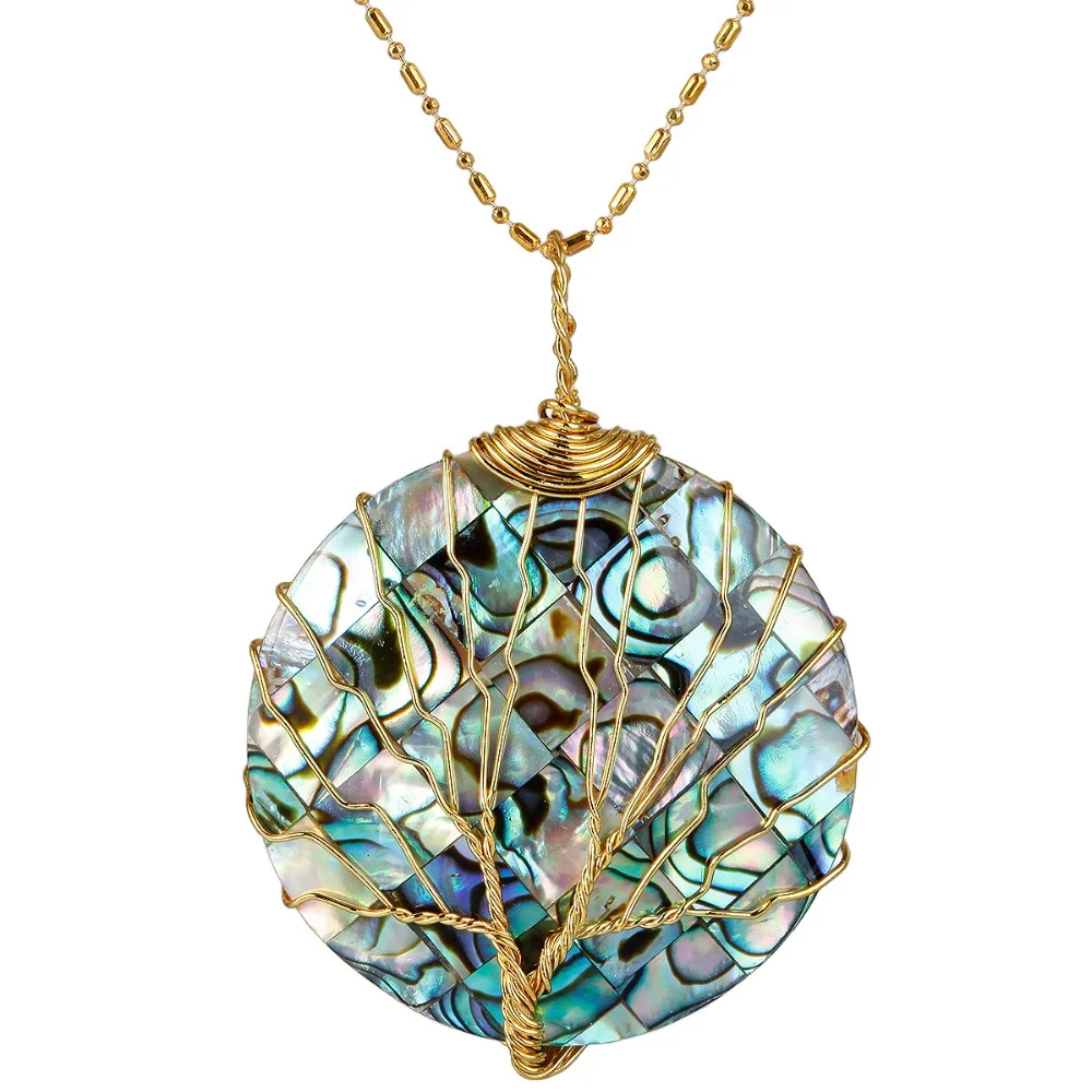 Tumbeelluwa Tree Of Life Pendant Necklace Healing Crystals Jewelry For Women Abalone Shell Golden Wire Wrapped Round