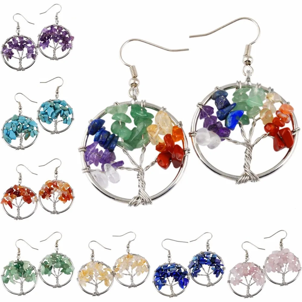Us 3 79 5 Off Tumbeelluwa Healing Chakra Tree Of Life Wire Wrapped Tumbled Stone Round Dangle Drop Hook Earrings In Drop Earrings From Jewelry