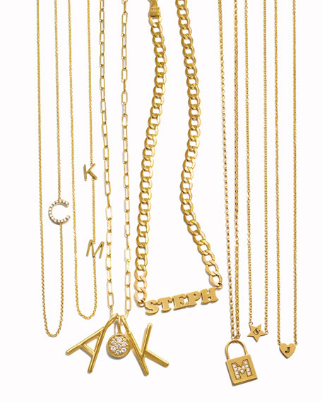 Can be personalized with a single lower case initial. Can be personalized with name or favorite word in lowercase letters up to 8 characters. 14k medium initial disc with diamond necklace 465.