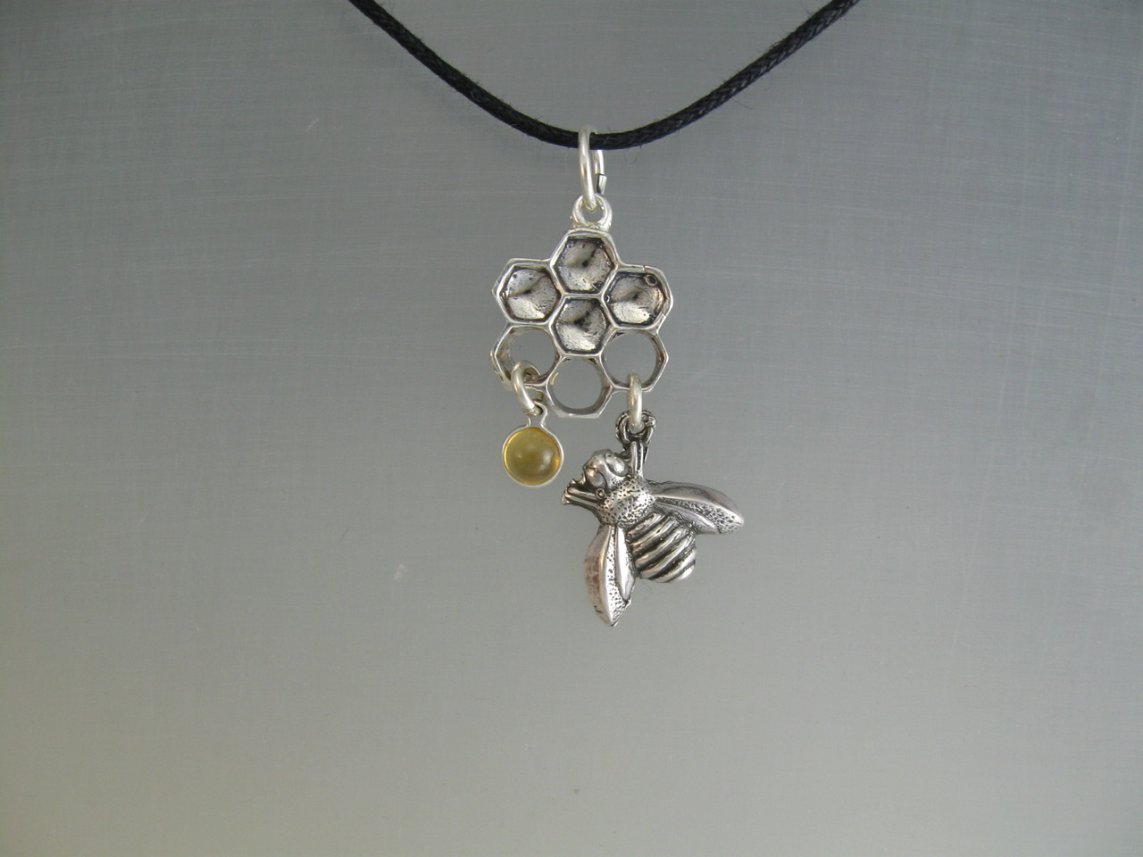 Honeycomb Circle With Bee And Citrine Dangles Pendant Necklace In Sterling Silver