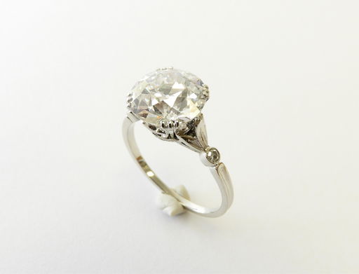Using the high end photography on their sites you can review diamonds up close before purchasing. Cut is the next important and also how jewelry stores trick you the most. This picture is of a 4 carat vintage engagement ring on a finger.
